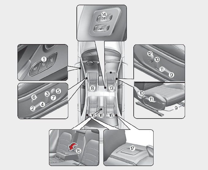 좌석의 전·후, 각도, 높낮이(사양 적용시)등을 조절하여 올바른 운전 자세가 되도록 하십시오.