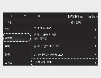 시동 「ON」 상태에서 설정 메뉴의 「라이트 → 하이빔 보조」를 선택하면 하이빔 보조가 켜지고 선택을 해제할 경우 꺼집니다.