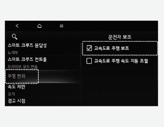 시동 「ON」 상태에서 인포테인먼트 시스템 「설정 → 차량 → 운전자 보조 → 주행 편의 → 고속도로 주행 보조」를 선택하면 앞차와의 거리와 운전자가 설정한 속도를 유지하며, 차로 중앙을 주행하도록 도와줍니다.