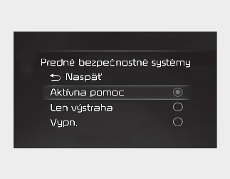 Keď je spínač zapaľovania alebo tlačidlo ENGINE START/STOP (Štart/vypnutie motora) v polohe On (Zap.), vyberte možnosť „Settings → Driver Assistance → Forward Safety“ („Nastavenia → Asistenčný systém → Bezpečnosť v smere dopredu”) na prístrojovej doske alebo „Settings → Vehicle → Driver Assistance → Forward Safety” („Nastavenia → Vozidlo → Asistenčný systém → Bezpečnosť v smere dopredu”) na obrazovke infotainment systému, aby ste nastavili, či sa majú používať jednotlivé funkcie.