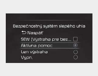 Keď je spínač zapaľovania alebo tlačidlo ENGINE START/STOP (Štart/vypnutie motora) v polohe On (Zap.), vyberte možnosť „Settings → Driver Assistance → Blind-Spot Safety“ („Nastavenia → Asistenčný systém → Bezpečnostný systém slepého uhla”) na prístrojovej doske alebo „Settings → Vehicle → Driver Assistance → Blind-Spot Safety” („Nastavenia → Vozidlo → Asistenčný systém → Bezpečnostný systém slepého uhla”) na obrazovke infotainment systému, aby ste nastavili, či sa majú používať jednotlivé funkcie.