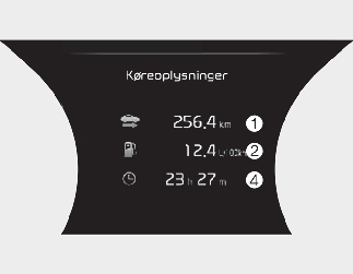 Dette display viser tripafstand (1), den gennemsnitlige brændstofeffektivitet (2) og den øjeblikkelige brændstoføkonomi (3) og den samlede information om køretid (4) en gang pr. tændingscyklus.