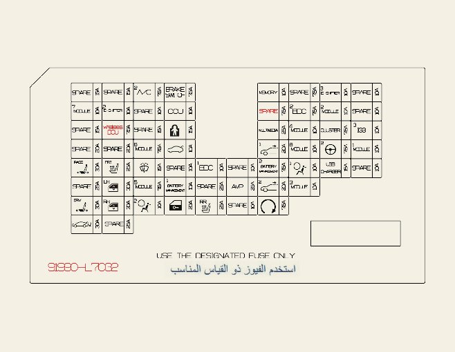 Cargador USB trasero, IBU (unidad de control de la carrocería integrada), audio, unidad principal de navegación y vídeo/audio, unidad del control de vista aérea, AMP (amplificador), BMS (sistema de gestión de la batería), ECU de estacionamiento ADAS, bloque de PCB (relé de toma de corriente) |