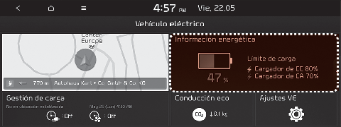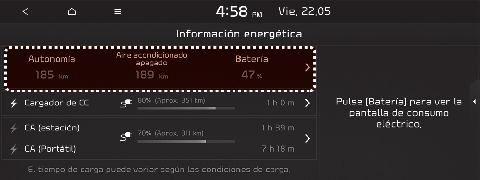 Permite comprobar la distancia que se puede recorrer, la potencia restante de la batería y el tiempo de carga previsto para cada tipo de cargador.