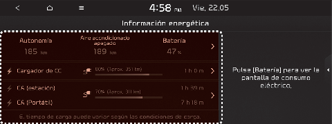 Seleccione "EV (vehículo eléctrico) → Energy information (información sobre energía)" en la pantalla.