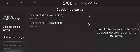 Puede ajustar la corriente de carga para un cargador de CA. Seleccione una corriente de carga adecuada para el cargador utilizado.
