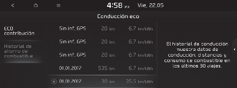 Puede comprobar la fecha de conducción, la distancia de conducción y el consumo promedio de energía de los últimos 30 viajes. La fecha con el ECO mayor se indica con un icono en forma de estrella.