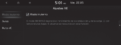 El modo invierno es eficiente durante el invierno cuando la temperatura de la batería de alto voltaje es baja. Se recomienda este modo para mejorar la conducción y el rendimiento de la carga de CC durante el invierno incrementando la temperatura de la batería al nivel adecuado. Sin embargo, esto podría reducir la distancia a vacío significativamente, ya que la batería de alto voltaje consume mucho más electricidad.