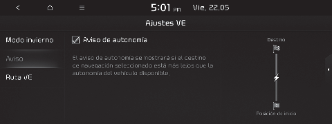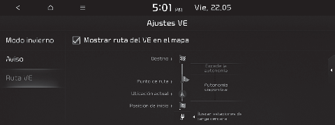 Permite establecer las funciones del modo invierno, advertencia y ruta del vehículo eléctrico.