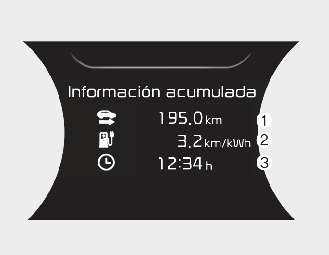 Para reiniciar los detalles, pulse y mantenga pulsado el botón OK (aceptar) mientras se muestra la Información de conducción acumulada. La distancia del recorrido, el consumo promedio de energía y el tiempo total de conducción se reiniciarán simultáneamente.