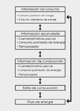 El sistema del vehículo eléctrico informa a los conductores del flujo de energía en varios modos de funcionamiento. Durante la conducción, el flujo de energía actual se especifica en 3 modos.