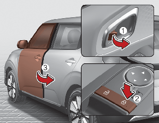 Para bloquear una puerta sin la llave, pulse el botón de bloqueo de la puerta interior (1) o el interruptor de cierre centralizado de las puertas (2) en la posición de "bloqueo" y cierre la puerta (3).