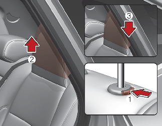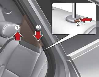 • To lower the headrest, push and hold the release button (2) on the headrest support and lower the headrest to the desired position (3).
