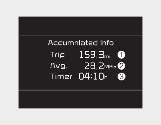 This display shows the trip distance (1), the average fuel efficiency (2), and the total driving time (3) information once per one ignition cycle.