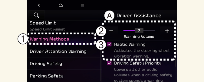 Certifique-se de que os Métodos de aviso que definiu se podem aplicar aos Métodos de aviso de outros sistemas de assistência ao condutor.