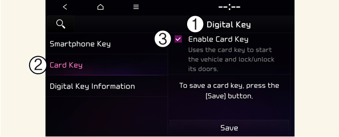When there is a digital key (card key) already saved in the vehicle, the Save menu is disabled. If you want to save a digital key again, refer to More Details and follow the deleting procedure first before saving a digital key.