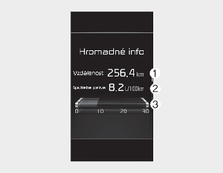 V tomto zobrazení jsou uvedené načítané denní kilometry (1), průměrná spotřeba paliva (2) a okamžitá spotřeba paliva (3).