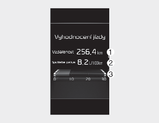 V tomto zobrazení jsou uvedené denní kilometry (1), průměrná spotřeba paliva (2) a okamžitá spotřeba paliva (3) vždy za jeden cyklus zapalování.