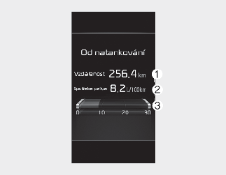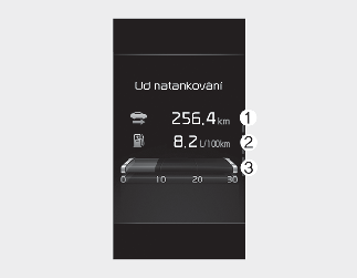V tomto zobrazení jsou uvedené načítané denní kilometry (1), průměrná spotřeba paliva (2) a okamžitá spotřeba paliva (3) od posledního doplnění paliva.