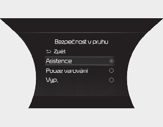 Při výběru ‚Off‘ (Vypnuto) se asistent udržování v jízdním pruhu vypne. Kontrolka na přístrojovém panelu zhasne.