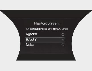 Nastavení časování výstrahy a hlasitosti výstrahy se vztahuje na všechny funkce asistenčního systému pro předcházení kolizím v mrtvém úhlu.