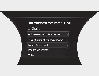Je-li tlačítko ENGINE START/STOP (nastartování/vypnutí motoru) v poloze ON (Zapnuto), můžete výběrem jednotlivých voleb Driver Assistance (Jízdní asistenti) → Blind-Spot Safety (Detekce mrtvého úhlu) v nabídce User Settings (Uživatelská nastavení) na LCD displeji nebo v nabídce Settings (Nastavení) → Vehicle (Vozidlo) na obrazovce informačního systému určit, zda má či nemá být používána určitá funkce.