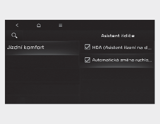 „Driver Assistance → Driving Assist → Highway Auto Speed Change“ (Jízdní asistenti → Asistence při jízdě → Automatické snížení rychlosti na dálnici) z nabídky Settings (Nastavení), abyste zapnuli adaptivní tempomat spolupracující s navigací, a zrušením volby funkci vypnete.