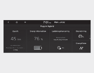 Menyn för laddhybriden består av fem sektioner: [EV-område], [Energiinformation], [Laddningshantering], [ECO-körning], [Energiflöde].