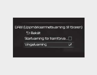 Om 'Leading Vehicle Departure Alert' (Startvarning för framförvarande fordon) väljs, informerar funktionen föraren när framförvarande fordon börjar köra efter att ha stått stilla.