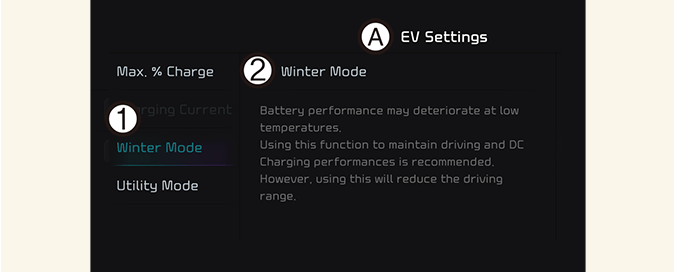 Ce mode est recommandé pour améliorer les performances de conduite et de charge en courant continu (CC) pendant l'hiver, en augmentant la température de la batterie à un niveau adéquat. Cependant, cela peut réduire considérablement l'autonomie car la batterie haute tension consomme beaucoup plus d'électricité.