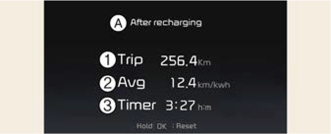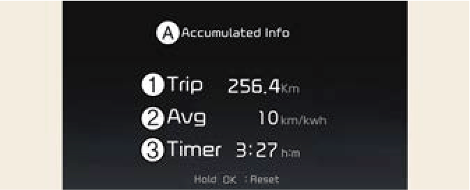 Pour réinitialiser les détails, maintenir enfoncé le bouton OK en regardant les informations de conduite cumulées. La distance parcourue, la consommation moyenne d’énergie et la durée totale du trajet sont réinitialisées simultanément.