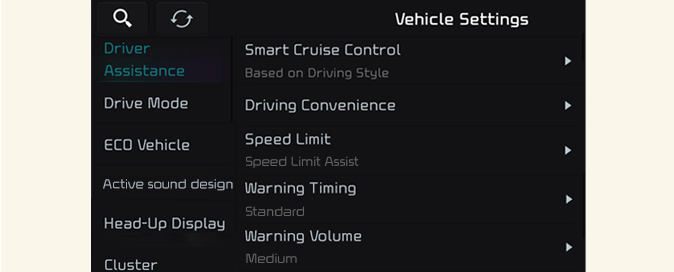sélectionnez Configuration → Véhicule → Assistance à la conduite sur l’écran du système d’infodivertissement pour définir la fonction Assistance à la conduite.