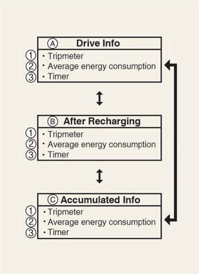 Après la recharge : La consommation moyenne d'énergie se réinitialise automatiquement lorsque la vitesse dépasse 1 km/h (1 mi/h), après une recharge de plus de 10 %.