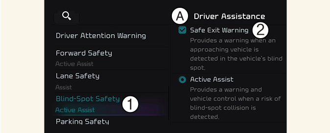 Avec le moteur en marche, sélectionnez Configuration → Véhicule → Assistance à la conduite → Sécurité dans les angles morts → Avertissement de sortie sécurisée à partir de l’écran du système d’infodivertissement pour activer la fonction Avertissement de sortie sécurisée et désélectionnez pour la désactiver.