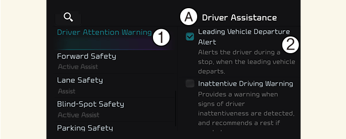 Avec le moteur en marche, sélectionnez ou désélectionnez Configuration → Véhicule → Assistance à la conduite → Avertissement d’attention du conducteur à partir de l’écran du système d’infodivertissement pour définir l’utilisation ou non de chaque fonction.