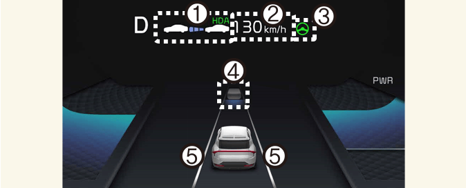 Indicateur d’aide à la conduite sur l’autoroute – indique s’il y a un véhicule devant vous et le niveau de distance sélectionné.