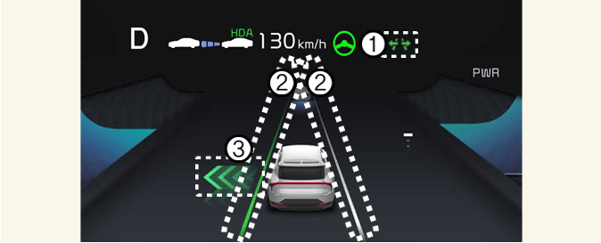 Lors de la conduite sur l’autoroute (ou voie rapide), si le régulateur de vitesse intelligent s’active, l’aide à la conduite sur l’autoroute s’activera.