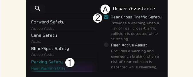 L’Assistance à la prévention de collisions de circulation transversale arrière s’active automatiquement au redémarrage du véhicule. Toutefois, si Off (désactivé) est sélectionné après le redémarrage du véhicule, le conducteur doit toujours être conscient de l’environnement immédiat et conduire prudemment.