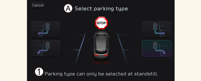 Passez le rapport en position R (marche arrière) pendant la recherche d’une place de stationnement, sélectionnez le type de stationnement et sélectionnez l’étape du mode de fonctionnement.