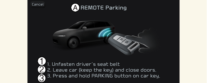 Lorsque la fonction Remote Smart Parking est annulée, le véhicule s'arrête automatiquement, passe la vitesse P (Park) et engage le frein de stationnement électronique (EPB).
