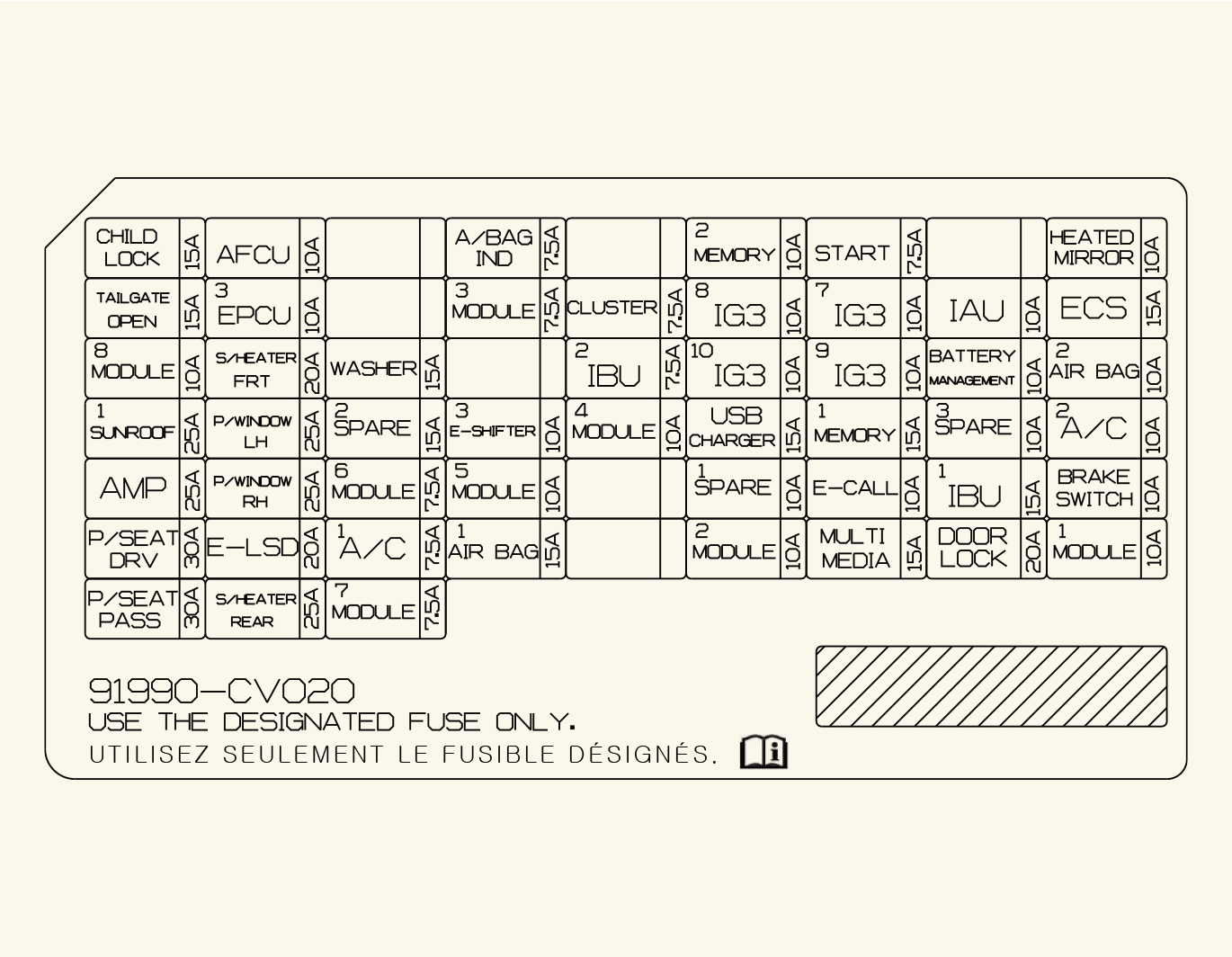 À l'intérieur du couvercle du panneau de fusibles/relais, vous pouvez trouver l'étiquette des fusibles/relais avec le nom des fusibles/relais et leur capacité.