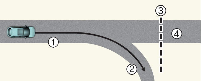 [1]: Trajeto de condução, [2]: Linha do ramal, [3]: Secção curva da estrada, [4]: Estrada principal