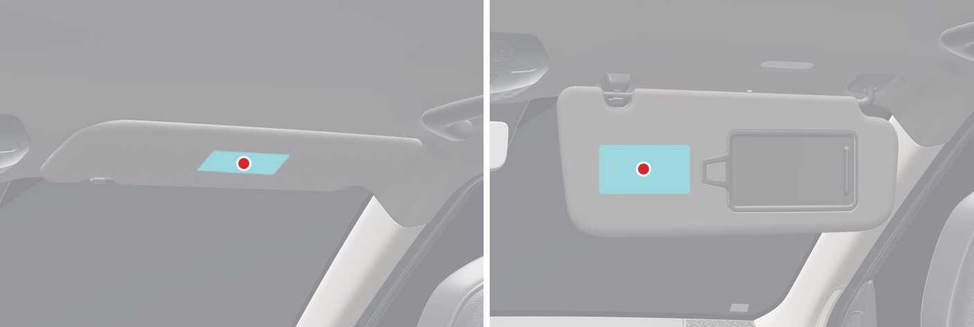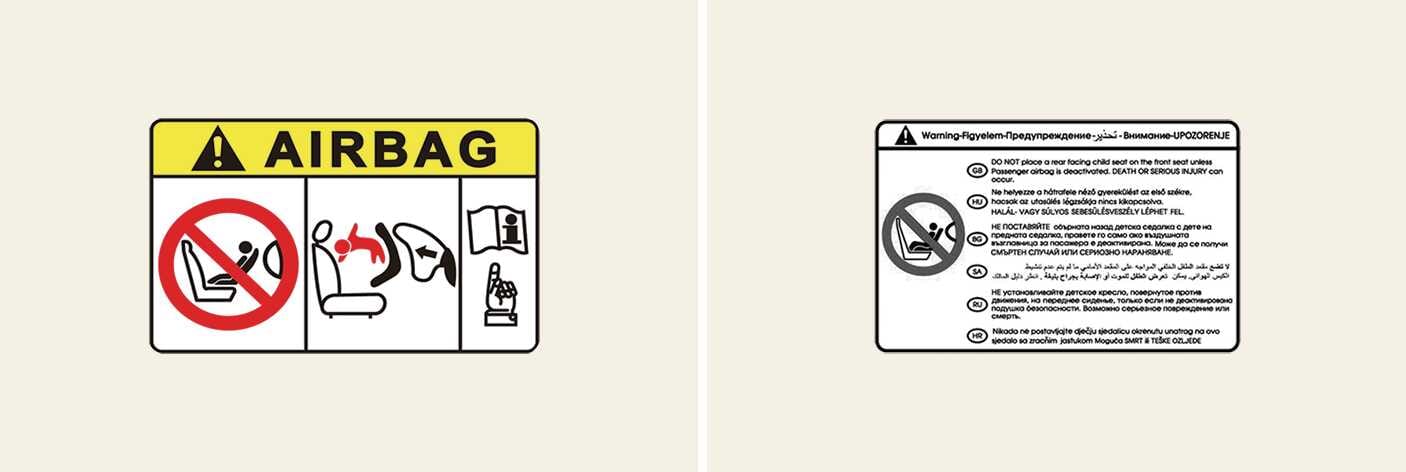 يتم إرفاق ملصقات تحذيرية خاصة بالوسائد الهوائية لتنبيه الركاب إلى المخاطر المحتملة لنظام الوسائد الهوائية.