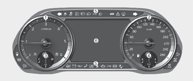 * 예시된 계기판 형상과 LCD 화면의 내용은 실제 차량의 형상 및 내용과 상이할 수 있습니다. 자세한 내용은 실 차량에 적용된 계기판과 뒷장 설명 부분을 참고하십시오.