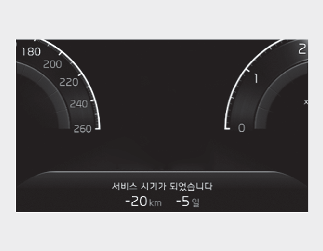 잔여 주행거리 1,500 km 또는 잔여 기간 30일 시점부터는 시동 「ON」 시 마다 서비스 알림 정보가 LCD 표시창에 자동으로 수 초 동안 표시됩니다.