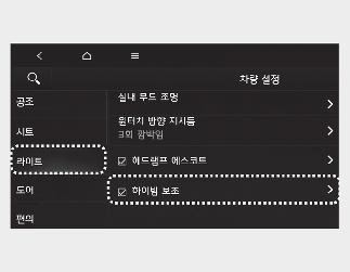 시동 「ON」 상태에서 인포테인먼트 시스템의 '설정 → 차량 → 라이트 → 하이빔 보조'를 선택하면 하이빔 보조가 켜지고 선택을 해제할 경우 꺼집니다.