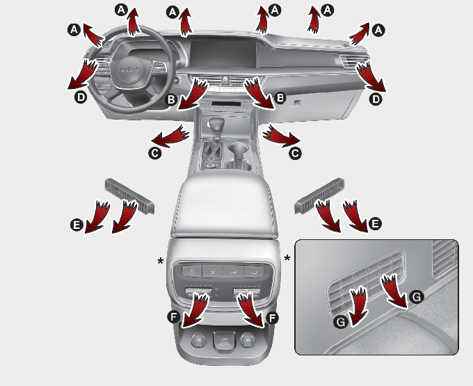 * 2열 송풍구 : E, F *(5인승 전용) / 3열 송풍구 : G + 루프 송풍구 (6/7인승 전용)