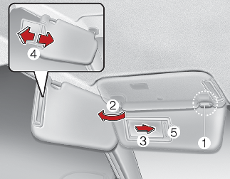 선바이저 안쪽의 커버(3)를 밀면 거울이 있습니다. 차량에 따라 보조 선바이저(4)를 앞, 뒤로 움직일 수 있습니다.