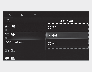 경고 음량을 변경하면 다른 운전자 보조 기능의 경고 음량도 같이 변경될 수 있습니다. 고려하여 변경하십시오.