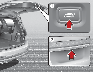 파워 테일 게이트 닫힘 버튼(1)을 누른 상태에서 동시에 파워 테일 게이트 핸들 스위치(2)를 3초 이상 누르십시오 (경보음 확인).